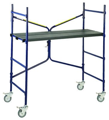 4-Ft., Steel, Standard Ladder, Mini Fortress Mobile Work Stand, 500 -Lb. Duty Rating, 500 -Lb. Load Capacity, Center Locking Hinge, Two-Wat Casters, 17-Inch x 43-Inch Work Surface, 2 Planks Per Unit, Exclusive Steel Wrap Connection, Adjustable Plank Heights of 12-Inch, 24-Inch, 36-Inch & 48-Inch, Also Use As A Workbench.